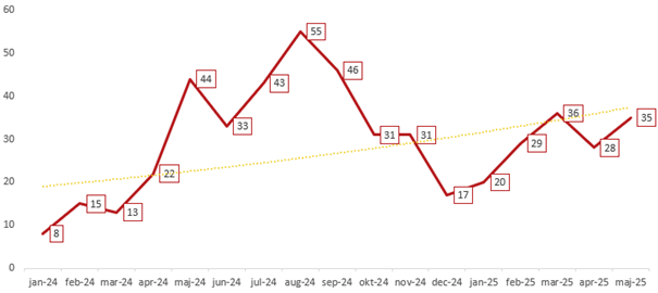 Diagrammet visar antalet efterlysta crossmotorcyklar från den 1 januari 2024 till 31 maj 2025.