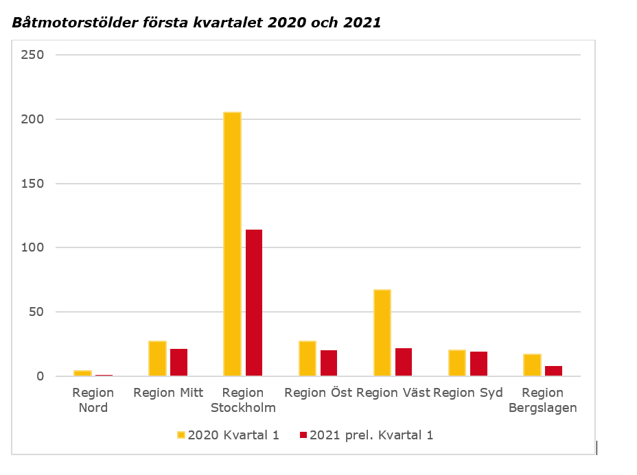 Båtmotorstölderna har under det första kvartalet 2021 minskat med 56% jämfört med samma period 2020. I relation till samma period 2019 så är minskningen hela 62,5% för båtmotorstölder.