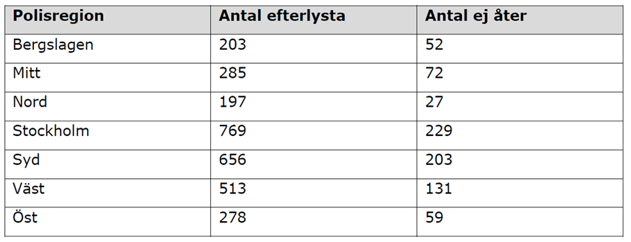 Tabellen visar vilken polisregion som bilarna blivit efterlysta i. Bilar som saknar information om efterlysande region eller som blivit efterlysta utomlands finns inte med i tabellen.
