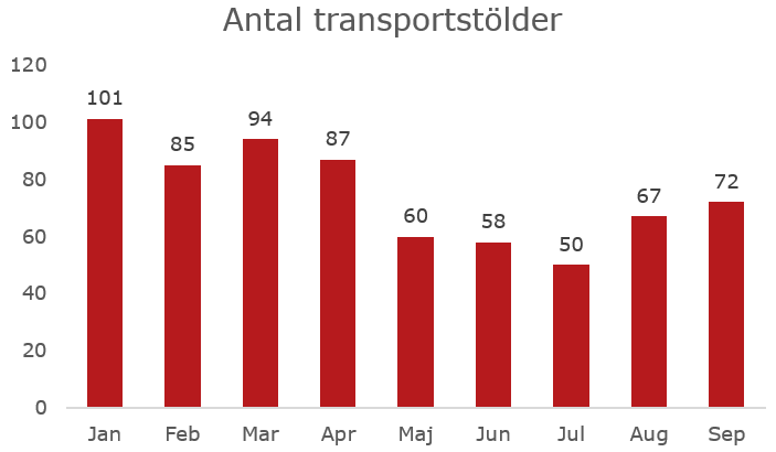 19 oktober 2022Under september månad har det polisanmälts 72 transportstölder. Det innebär att det totalt i år har polisanmälts 674 transportstölder. Det visar statistik från Polisen.
