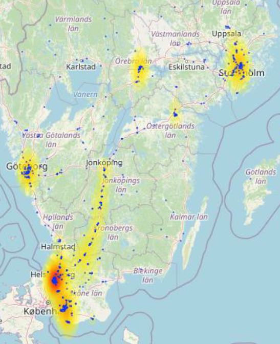 Varje prick motsvarar ett anmält brott. Anmälda brott utan angiven brottsplats visas ej på kartan. Källa: Polisen