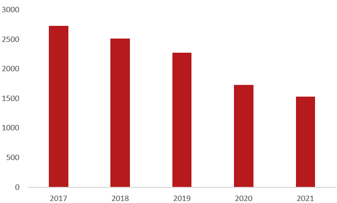 Diagrammet visar antalet anmälda båtmotorstölder mellan 2017-2021.