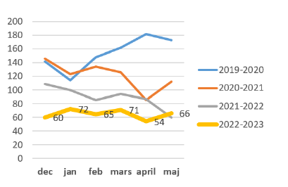 Diagrammet visar antalet stölder de senaste sex månader jämfört med tidigare år.