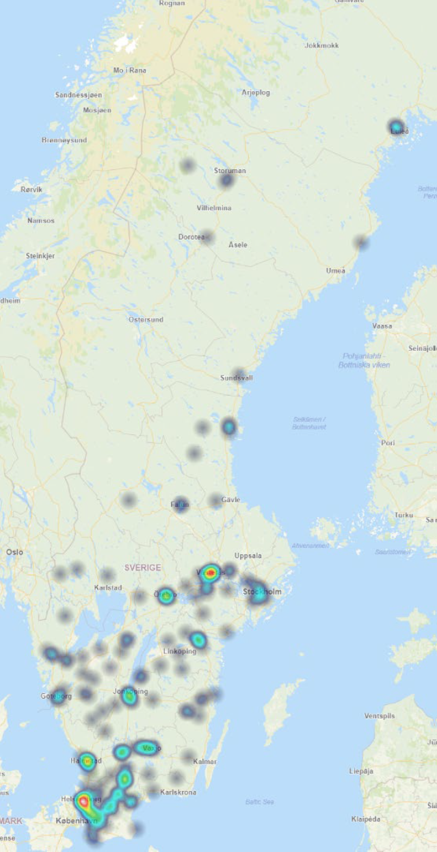 Kartan nedan visar geografiskt vart stölderna av diesel skedde i maj månad.