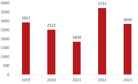Under 2023 anmäldes det 906 transportstölder, vilket är färre antal stölder jämför med året innan då det anmäldes 1014 stölder. 58 procent av stölderna under år 2023 inträffade under de två sista kvartalen.