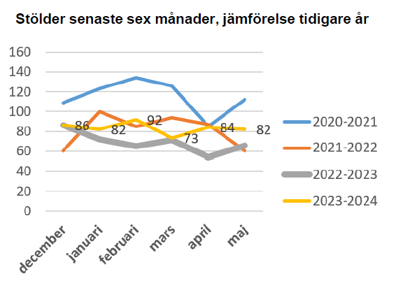 Bilden visar antalet stölder de senaste sex månaderna, jämförelse tidigare år. Källa Polisen.