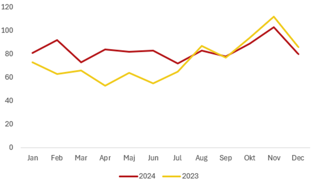 Diagrammet ovan visar antalet anmälda transportstölder under 2023-2024.