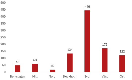 Diagrammet visar antalet stölder under 2024 fördelat på polisregion.