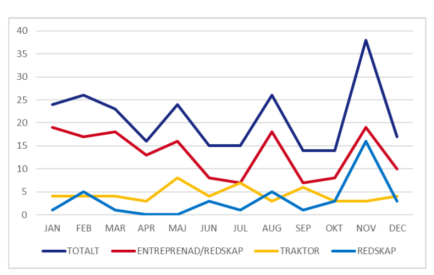Antalet efterlysta entreprenadmaskiner/redskap och traktorer har minskat med 11 procent under 2020 jämfört med 2019. Anledningen till minskningen är sannolikt en effekt av stängda gränser i samband med pandemin under delar av året.
