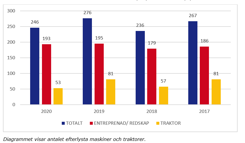 25 januari 2021Under 2020 har det efterlysts 252 entreprenadmaskiner/redskap och 53 traktorer. Det är en minskning med 11 procent jämfört med 2019.