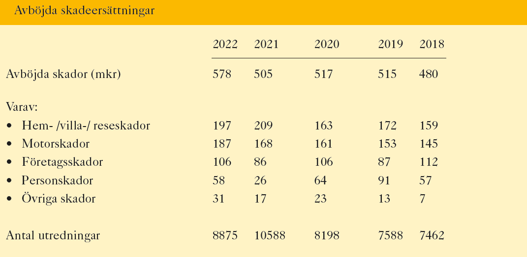 Under 2022 utredde försäkringsbolagen 8 875 misstänkta bedrägerier och oklara försäkringsfall. Utredningarna resulterade i att försäkringsbolagen avböjde skadeutbetalningar till ett värde av 578 miljoner kronor, vilket kan jämföras med 2021 då bolagen avböjde skador till ett värde av 505 miljoner kronor.