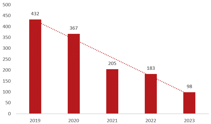Diagrammet visar antalet anmälda båtmotorstölder de senaste fem åren under första kvartalet.