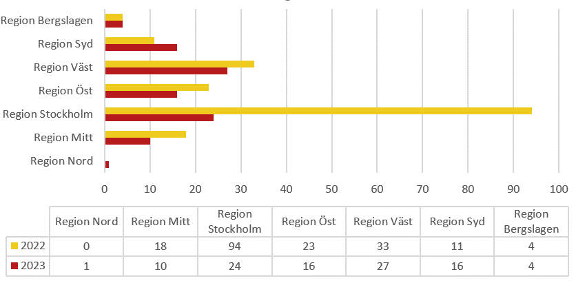 Diagrammet visar antalet stölder av båtmotorer under första kvartalet 2023 och 2022.
