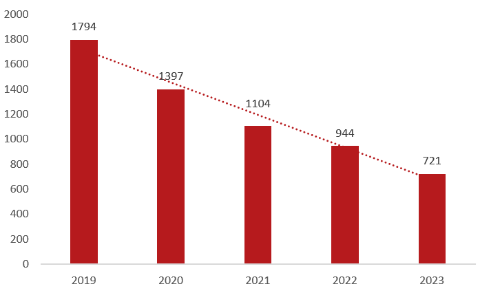 Diagrammet visar antalet stölder av båtmotorer under de tre första kvartalen 2019–2023.