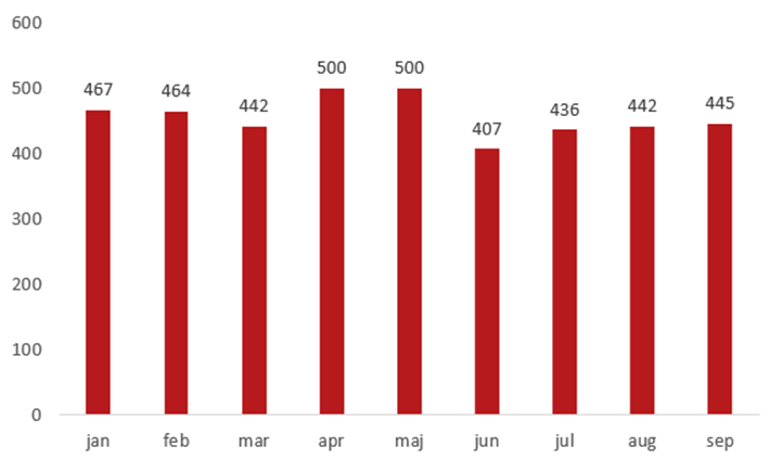 Diagrammet visar antalet efterlysta personbilar under 2024 fördelar per månad.