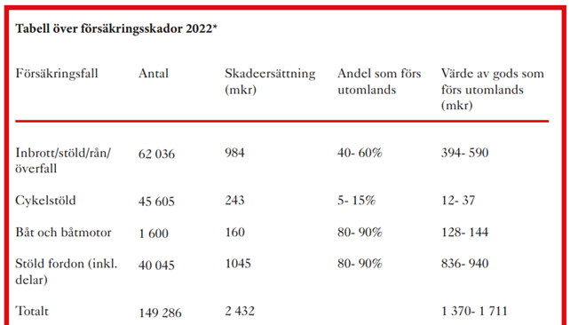 Mycket av stöldgodset försvinner utanför våra gränser. Enligt en uträkning av Larmtjänst försvinner ungefär hälften av stöldgodset utomlands. När det gäller stölder av båtmotorer, fordon och bildelar beräknas 80–90 procent av godset försvinna utomlands.