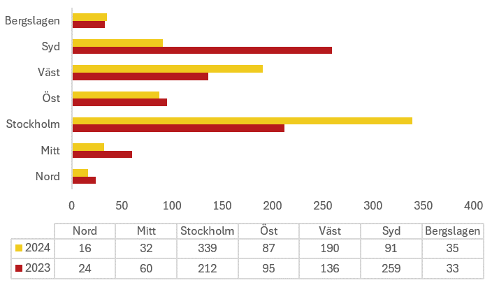 Diagrammet visar antalet båtmotorstölder per region under första halvåret 2023–2024.