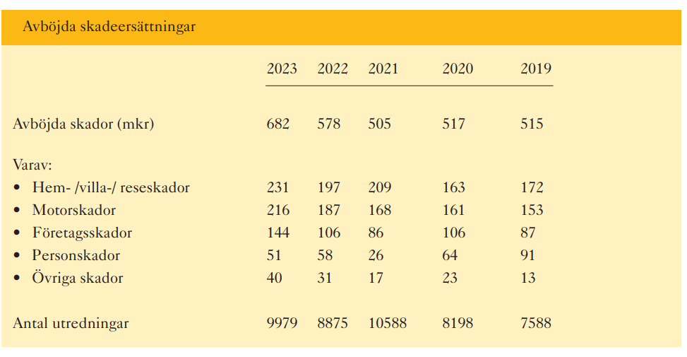 Under 2023 utredde försäkringsbolagen 9 979 misstänka bedrägerier och oklara försäkringsfall vilket är fler jämfört med föregående år då det utreddes 8 875 misstänkta bedrägerier. Utredningarna under 2023 resulterade i att försäkringsbolagen avböjde skadeutbetalningar till ett värde av 682 miljoner kronor, vilket kan jämföras med år 2022 då bolagen avböjde skador till ett värde av 578 miljoner kronor.
