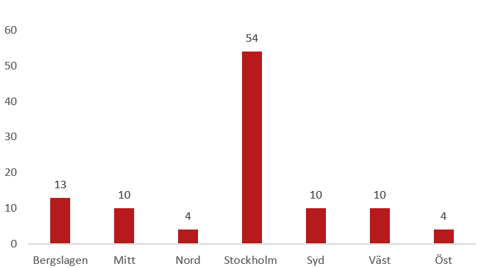 Diagrammet visar antalet efterlysningar av maskiner under 2024 fördelat per polisregion. 55 maskiner saknar information om län och ingår inte i diagrammet ovan.