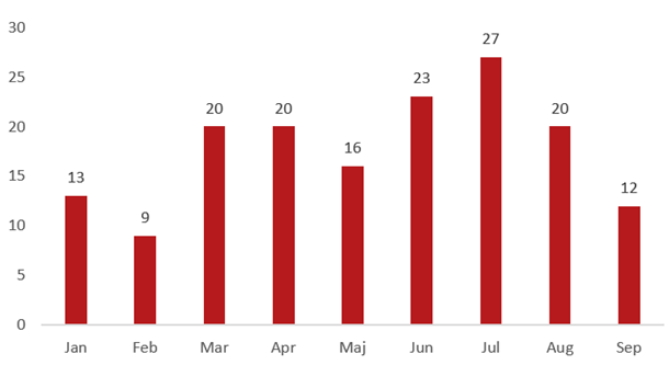 Under 2023 ökade antalet efterlysningar av entreprenadmaskiner och ökningen har fortsatt under 2024. Mellan den 1 januari och 30 september har 160 maskiner efterlysts, vilket kan jämföras med 154 maskiner under samma period 2023.