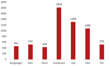Flest antal efterlysningar kommer från polisregion Stockholm (1818) och Syd (1309).