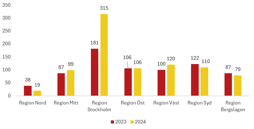 Det största antalet stölder har inträffat i polisregion Stockholm, där 315 båtmotorstölder har anmälts. Detta kan jämföras med 181 stölder under samma period 2023, vilket innebär en ökning på 74 procent. Även i polisregion Väst syns en ökning. Under året har 120 motorer anmälts stulna vilket kan jämföras med 100 motorer under samma period 2023.