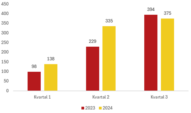 Diagrammet visar antalet stölder fördelat per kvartal under 2023 och 2024.